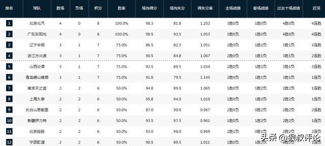 CBA最新排名:京粤4连胜争第1辽宁领衔4队紧随3队一胜难求