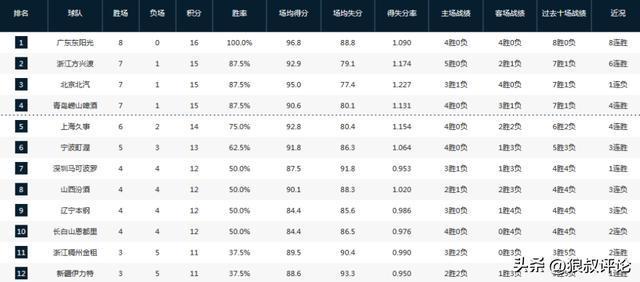 CBA最新排名:广东8连胜冲上榜首黑马战绩狂飙山西连败意外掉队