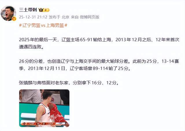 麦穗丰老师真是太逗了,辽宁男篮输球,居然说是“爆冷”。辽宁男篮的实力现在都这样了,怎么能是爆冷呢?明明是实力使然。 北京媒体人三土带刺老师则表示:2025年的最后一天,辽篮主场65-91输给上海,2013年12月之后、12年来首次遭遇四连败。26分的分差,也创造辽宁与上海交手间的最大输球分差。此前为25分,13-14赛季,2013年12月11日,辽宁客场曾89-114输了25分。张镇麟与弗格面对老东家,分别拿下16分、12分。
