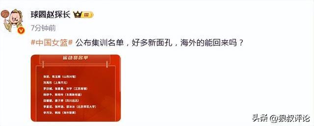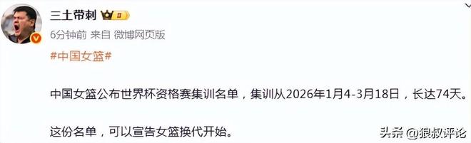 北京时间12月31日,根据中国女篮官方社媒的公示,为备战2026年国际篮联女篮世界杯资格赛,中国篮球协会将在2025-2026中国女子篮球联赛第十一轮比赛结束后,于2026年1月4日起在北京体育大学组织国家女篮集训选拔工作。 这一份名单则是引发外界的广泛热议,李梦,黄思雨,杨力维,黄思静等95后彻底淡出国家队外,上一周期的核心后卫李缘同样缺席。 具体名单如下: 分别是:张茹、陈玉婕 (山西兴瑞); 刘禹彤 (上海开元); 罗欣、张曼曼、孙宇 (江苏南钢); 杨舒予、陈明伶 (东莞新彤盛); 田媛媛、唐子婷 (四川远达); 李星诺、张梓涵、邵冰冰 (北京师范大学); 李月汝、韩旭 (海外联赛)。 而亚洲杯期间重点培养的张子宇同样不在名单内。 媒体人“三土带刺”发文点评:中国女篮公布世界杯资格赛集训名单,集训从2026年1月4日-3月18日,长达74天。 这份名单,可以宣告女篮换代开始。 媒体人“赵探长”发文点评:中国女篮集训名单,好多新面孔,海外的能回来吗? 根据山东媒体的报道,张子宇将会在1月4日,山东女篮主场对阵河北女篮的比赛,迎来WCBA职业生涯的首秀。 只是从18岁参加正规的国家队训练和比赛,再到如今集训选择WCBA联赛为主,确实是让人意外。要知道,杨舒予这种已经在广东女篮担任绝对核心的球员,选择进入国家队女篮训练。 有球迷点评说道:张茹伤病没恢复好呢吧 联赛都没打 张子宇不参加吗? 刘禹彤时隔多年再次回归国家队。 |