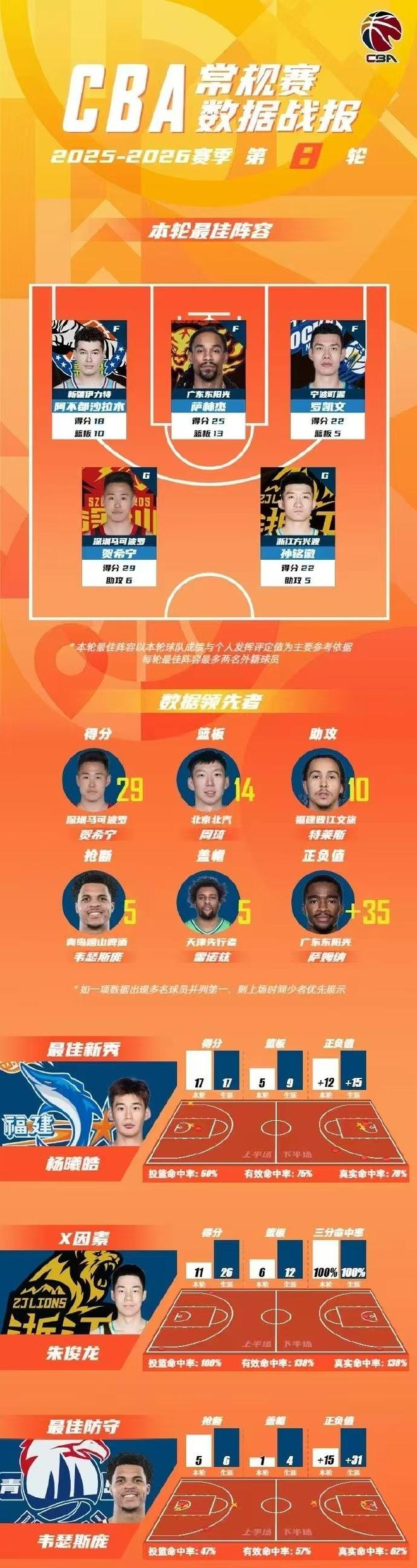 CBA官宣常规赛第8轮最佳阵容,新疆队长阿不都8中7高效18+10+7率领新疆大胜结束4连败领衔,萨林杰25+13率领广东开局8连胜唯一不败领跑,贺希宁29+6+6送辽宁3连败,罗凯文与孙铭徽均是22+5入选,孙铭徽率领广厦送北京首败。