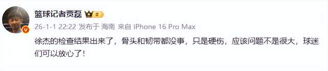 徐杰是在第二节受伤的。他在一次参与防守中,被前队友周琦硬生生铲倒在地,当时就起不来了,随后被队友背出的赛场。随着徐杰的离场,广东队一溃千里,惨不忍睹,狂输31分。 而徐杰表情痛苦无法行走的画面,令人揪心。赛后,杜锋表示徐杰已经去拍片检查去了。随后,北京篮球记者贾磊在社交平台给出徐杰伤情,“徐杰的检查结果出来了,骨头和韧带都没事,只是硬伤,应该问题不是很大,球迷们可以放心了!”