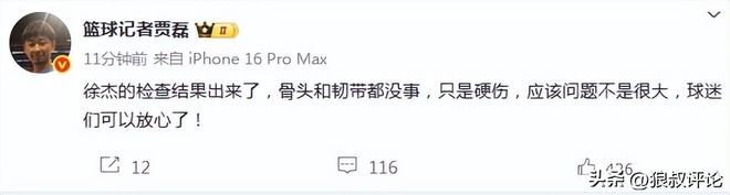 虚惊一场!徐杰伤情拍片结果:骨头和韧带都没事,只是硬伤