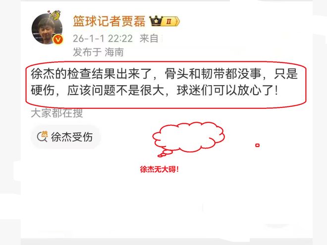 根据最新消息了解,徐杰的检查报告也是出来了,他的韧带和骨头都没有事,这也说明了,他不会有大碍。看到这样的一则消息,很多球迷也是十分开心,一颗为徐杰担忧的心,也是可以放下了。 至于,徐杰接下来,会不会参加与北控队的比赛,现在还是一个未知数。毕竟,徐杰要不要参赛,这要主教练杜锋和队医进行评估。不过,笔者认为真的没有必要,为了一场比赛胜利,没有必要让徐杰再一次冒着受伤的风险,也许,让徐杰休息一下更为妥当。各位看官,您说呢? |