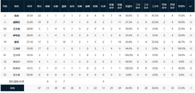 此役,杜锋一共用了9人轮转,只有2人配得上优秀,一是外援萨姆纳,他继续展现全能身手,首节便主导球队串联,第二节开始发力得分,全场贡献17分和6次助攻,维持了近乎完美的输出节奏。可惜的是,加时大赛前就5犯毕业,给了对手翻盘的机会。 另一位就是刚刚伤愈复出的徐杰,他继续延续着受伤前的火热状态,进攻端14投7中高效砍下22分,关键时刻多次挺身而出,用强硬防守和精准投篮为球队续命,其表现堪称本赛季最佳之一。