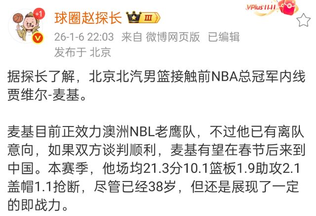 之前北京首钢接触了几位在CBA打过球的内线,但都不符合球队的要求,毕竟北京首钢的目标就是冲击总冠军,加上已经使用了一次更换外援资格,那么到了季后赛,调整的机会就不多了。 北京首钢在这样的前提下,开始接触麦基,由于NBL赛季结束的很早,所以麦基也有离队的想法,毕竟两份合同影响不大。
