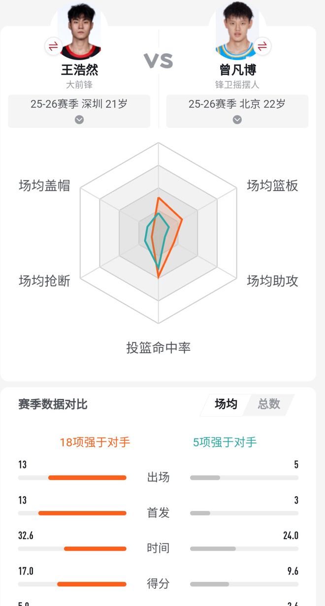 还不信?来看看王浩然本赛季的个人数据,场均出战32.6分钟,场均得分17分5.9篮板2.4助攻,投篮命中率48.1%,三分球44.1%,罚球75%,得分排在联盟第21位,本土球员中仅次于郭昊文、林庭谦、贺希宁位居第4;三分投篮命中率排在联盟第11位。 再来对比一下同类型的锋线,和曾凡博相比,王浩然有18项数据强于对手,场均得分多了将近8分,三分投篮命中率高出15.5%;