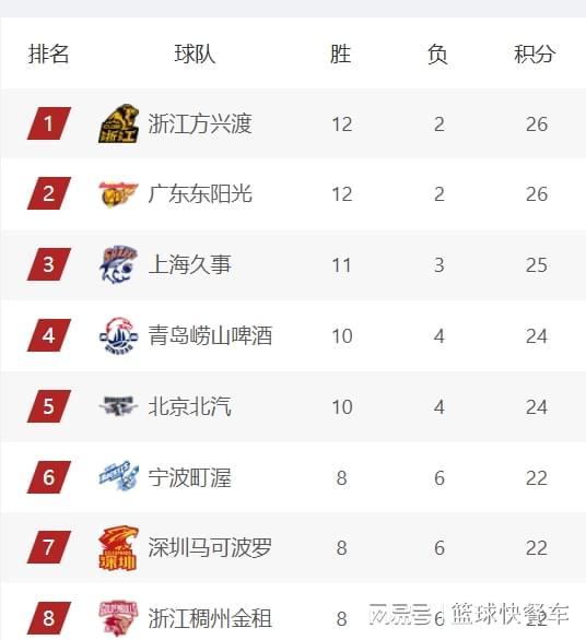 CBA积分榜最新排名出炉!广厦杀回第1:广东第2辽宁仅第10