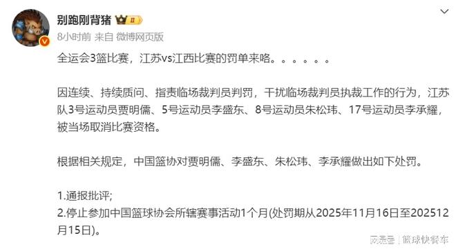 这一场比赛发生在全运会三人篮球小组赛,江苏队与江西队的比赛,朱松玮、贾明儒、李盛东、李承耀。由于不满裁判的判罚,朱松玮、贾明儒等人在比赛中不断质疑裁判,并且指责干扰裁判临场吹罚。随后裁判也不予示弱,直接将4人当场夺权驱逐出场。在朱松玮等人被驱逐出场后,外界也引发了诸多争议与质疑。有人认为,裁判这是杀鸡儆猴,这种做法没错。也有人认为,裁判过于苛刻,小题大做。 不过,在事情发生不久后,全运会竞委会便直接宣布,朱松玮、贾明儒等4人将会被禁赛一场。不过,由于当时江苏队的比赛已经结束,这也就意味着,这所谓的1场禁赛,其实意义不大。可针对朱松玮等人不满裁判处罚一事,中国篮协还是比较重视的是。这不,在经过几经深思熟虑后,篮协终于还是开出了罚单,针对他们4人质疑裁判,篮协最终开出了4人禁赛1个月的处罚。 据悉,这一次处罚时间为2025年11月16日,到2025年12月15日,在这一个月内,朱松玮、贾明儒等4人都将被禁赛。而根据CBA新赛季的安排,CBA季中赛第一阶段的比赛,将会被安排在12月3日开打,而CBA新赛季揭幕战则安排在12月12日。换句话说,CBA季中赛和揭幕战,朱松玮和贾明儒等人是打不了了。对于他们和他们所在的俱乐部而言,确实是一个不小的打击。 最近几年,中国篮协在球员问题上抓的比较严厉,基本都是采取零容忍态度。前阵子,广东队的吉伦沃特和新疆队的哈雷尔,两人因为违规用药问题,被直接禁赛三个月,而且,他们所在的俱乐部广东队和新疆队,都被处罚60万。而对于CBA球员对裁判不满或者赛后指责等问题,篮协方面也是“零容忍”,一旦有球员针对裁判问题进行指责或者炮轰,基本都会被处罚。 目前,距离CBA新赛季开赛只剩下不到一个月的时间,随着CBA新赛季的临近,各支球队也进入到最后的备战阶段。不过,由于中国队在接下来还要参加男篮世预赛,像胡明轩、赵睿、周琦、胡金秋等人,他们还需要参加中国队的比赛。而在过去这短短两周时间内,中国篮协已经先后开出了两张罚单,在CBA常规赛还没有开打前,也希望其他球队能够遵守规则,避免再次遭到处罚。