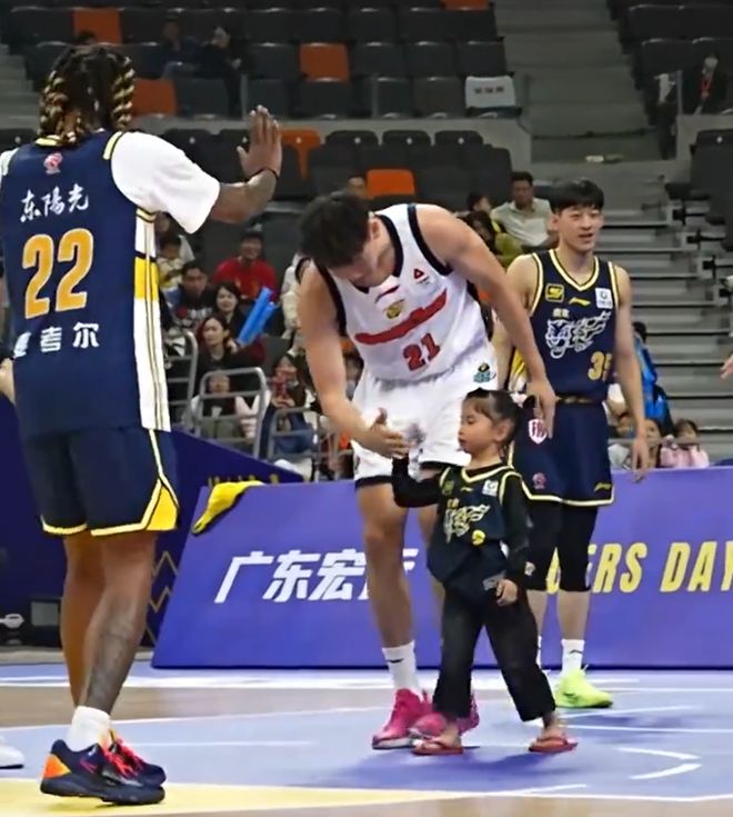 接下来,广东队球员在上演的对抗表演赛中,意外出现了一段充满童趣的插曲。 一位5岁的小球迷受邀登场,只见她脚上一双标志性的——人字拖,俨然是“广东特色”的生动写照。 面对场上5名广东队球员组成的“防守阵容”,这位小女孩毫不怯场,在球员张昊的默契配合与托举下,成功完成一记扣篮。