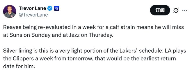 北京时间12月13日,湖人队传出坏消息,奥斯汀-里夫斯遭遇左侧小腿轻度拉伤,预计一周后重新接受伤情评估。这意味着里夫斯将至少缺席一周的比赛。