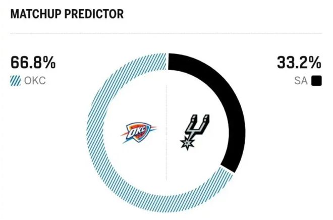 赛前,美媒ESPN对本场比赛进行了胜率预测,马刺队胜率仅有33.2%,依旧不被看好,雷霆队胜率则高达66.8% 。 首发阵容方面,马刺队这边,文班亚马因左小腿伤病管理出战成疑,教练排出的最新首发五人组为:哈里森-巴恩斯、斯蒂芬-卡斯尔、达龙-福克斯、德文-瓦塞尔、卢克-科内特;雷霆队这边,杰林缺阵,切特和哈滕迎来复出,首发阵容则为:亚历山大、杰伦-威廉姆斯、多尔特、哈滕、切特-霍姆格伦。