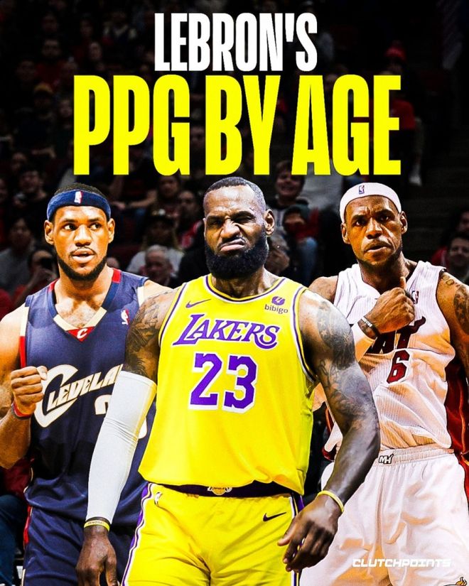 有媒体BronMuse统计并公布了詹姆斯从出道的18岁到41岁生日前的40岁,每个年龄段的最高得分。其中18岁最低,只有37分,当时詹姆斯才出道。40岁还有42分。最高是29岁,61分。第二低反而在巅峰期,大概因为不需要发力,34岁、39分。其他都是40分、50分这个区间。CLUTCHPOINTS统计的是每个年龄段的场均得分,18岁是20.2分,最低,21岁最高,30.2分,37岁是30.1分,40岁是24分,其他是25、26、27、28、29分。 詹姆斯在41岁生日战输了,数据也一般,但他在此前22个赛季的10次生日战,场均32.9分7.1篮板6.9助攻,投篮命中率55.5%,三分球命中率42.3%。太可怕了!这就是詹姆斯,历史第一人詹姆斯。