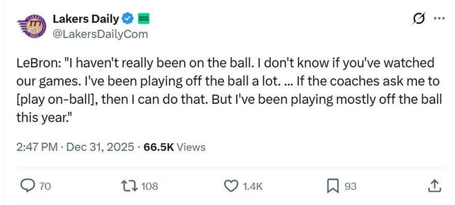 Lakers Daily之所以为詹姆斯鸣不平,也是因为后者在采访中谈及这一话题。 被问到球权相关问题时,詹姆斯公开表示:“我其实并没有太多持球,如果你看了比赛,就会发现我更多是在打无球,如果教练要求我打持球,我也可以做,但本赛季我更多是打无球。”