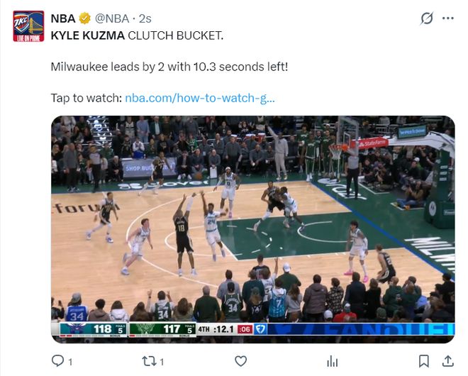空接暴扣准绝杀!字母不足30分钟30+10+5雄鹿逆转16分剑指前十