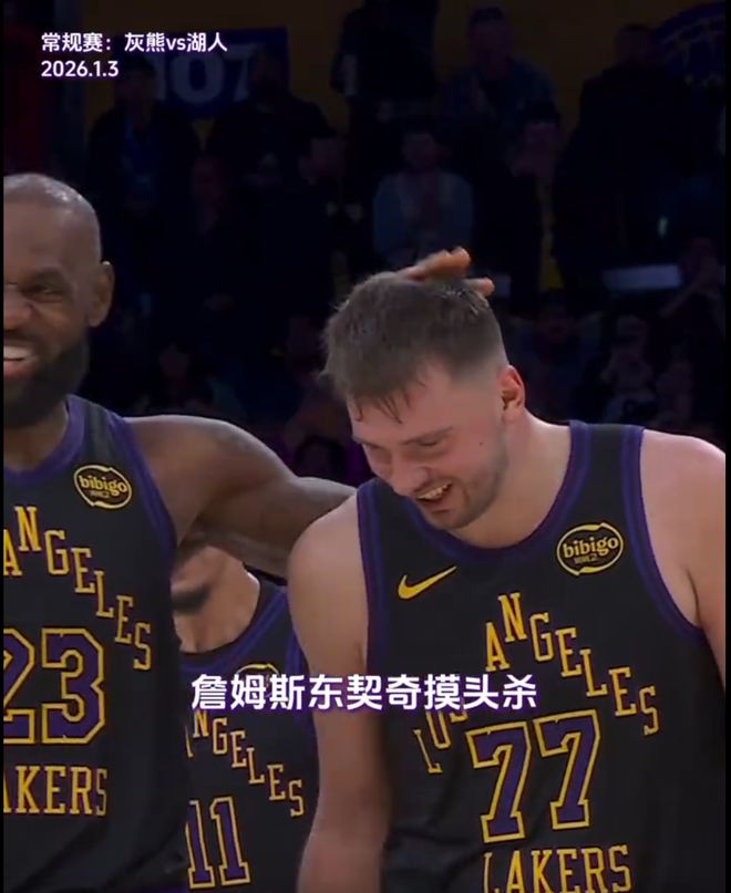 在湖人对阵灰熊的比赛末节,詹姆斯打成关键球后,笑嘻嘻地走向了东契奇,