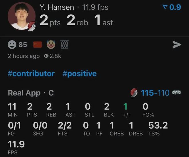 杨瀚森替补出战约11分钟,投篮1中0,罚球2中2得到2分2板(1前场板)1助2帽,其中封盖数全队第一,帮助开拓者115-110干翻高居西部第二的马刺。