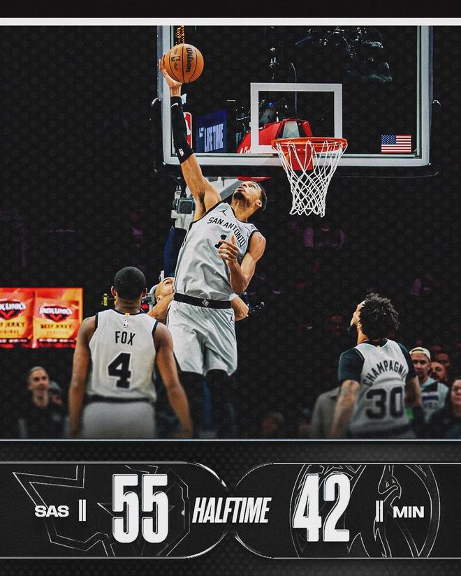 森林狼外线命中率辣眼睛,上半场全队三分球只有16中3!上半场打完,马刺55-42领先森林狼13分。戈贝尔3中1,得到2分8篮板,正负值-10。里德7中1,兰德尔5中1!易边再战,马刺一直压制森林狼,分差最多来到19分。