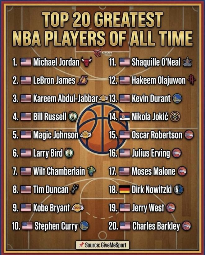 NBA历史最伟大球员TOP20发布!库里排名第10奥尼尔第11合理吗