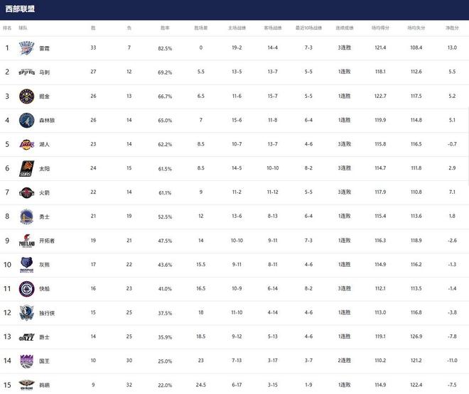 1-3名:雷霆(33胜7负)、马刺(27胜12负)、掘金(26胜13负)
