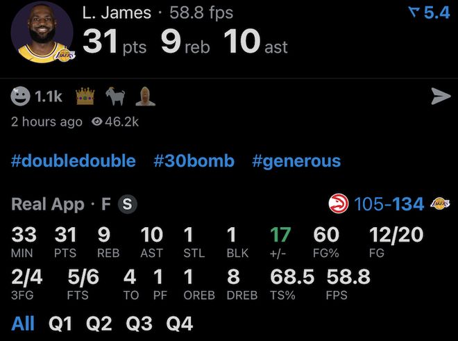 1月14日。赛前三连败的湖人大胜赛前三连胜的老鹰。老鹰虽然排名只是东部第九,三连胜也只是战绩,真正让外界感觉他们非常猛的趋势是他们在交易特雷·杨以前就展现出来的团队篮球,交易特雷·杨,只等处理掉CJ麦科勒姆的合同,就可以复制十年前的四大全明星强队老鹰了。 因为老鹰非常猛,所以有些小黑子再次造谣詹姆斯不敢上,但背靠背的詹姆斯不仅上场打球,而且得到31分9篮板10助攻!在比赛过程中,更是把近期非常猛的老鹰打成东部第一都在东决被詹姆斯基本单核带队(乐福缺席,欧文只打两场)横扫的那支老鹰。 老鹰在比赛中一度落后32分,但在湖人放松后,直接一波流追到只剩下11分。詹姆斯这个时候站出来,一个暂停后的3分球命中,拉开湖人的止血之旅,接下来东契奇助攻斯玛特和自己突破,三人联手再次让湖人扩大比分到20分以上,最终141比116击败老鹰,排名从赛前跌至西部第六再次重返西部前五,跟西部第二的马刺也只差2个胜场。 詹姆斯赛季第一次背靠背,面对近期非常猛的老鹰,而且比赛过程中还受伤但原地复出,直接打成今日NBA最佳球员,詹姆斯的数据是:32分35秒,20投12中,三分球4中2,6罚5中,31分9篮板10助攻,正负值+17——超越对手老鹰任何球员,更是比对手首发控卫沃克高出+54!詹姆斯还是提前打卡下班,拒绝刷数据。詹姆斯职业生涯这种只差1个篮板或1个助攻的超级准三双太多了,保守估计超过两位数。詹姆斯毕竟不是科比或库里,詹姆斯从来不刷数据,也不会熬工龄,他再次用实战说明了这个事实。 |