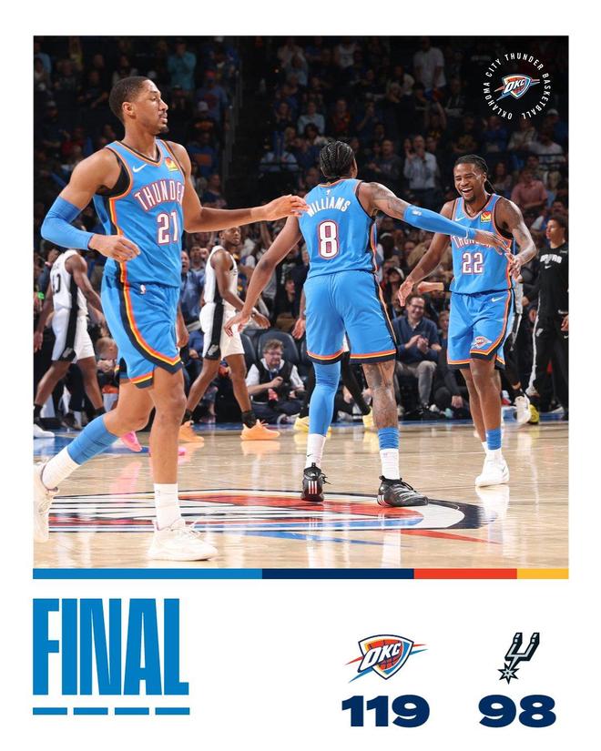 卡斯尔外线命中,文班亚马因伤下场休息,福克斯跳投得手,卡斯尔打成了2+0,马刺连追7分。杰伦威廉姆斯上篮得分,亚历山大中投得分,杰林威廉姆斯外线命中,米奇约翰逊再次请求暂停。亚历山大跳投得分,马刺连续失误,杰伦威廉姆斯抢断后完成暴扣,亚历山大送出大帽,随后2罚1中,雷霆轰出了12比0的冲击波将分差扩大至16分。 文班亚马、亚历山大各有远投不进,戴格诺特技术犯规,尚帕尼罚球命中为马刺打破得分荒。杰林威廉姆斯中投得分,福克斯、亚历山大各有上篮打进。福克斯2罚全中,亚历山大轰进压哨远投,卡斯尔上篮得手,肯里奇威廉姆斯外线命中,雷霆取得19分领先。第3节打完,OKC以95比76领先,马刺单节以24比40落后。亚历山大单节15分,杰伦威廉姆斯10分,卡斯尔10分,福克斯7分。 末节决战,巴恩斯跳投三不沾,杰伦威廉姆斯上篮得分,霍姆格伦连续犯规,卡斯尔外线打铁,以赛亚乔轰进远投,雷霆取得24分领先。沃特斯外线取分,文班亚马2罚1中,米切尔上篮打进。霍姆格伦大帽沃特斯,文班亚马暴扣,霍姆格伦进攻犯规,哈珀外线命中。米切尔进攻犯规,霍姆格伦大帽卡斯尔,凯尔登约翰逊里突外投连得5分。马刺打出了13比1的攻势,胜负悬念再起。 米切尔2罚全中,凯尔登约翰逊被封盖,亚历山大连续单打不进,杰林威廉姆斯2罚1中,尚帕尼2罚不中。科内特暴扣,福克斯外线打铁,亚历山大2罚全中,卡斯尔被封盖。亚历山大单打不中,华莱士抢断,戴格诺特请求暂停。卡鲁索跳投得分,亚历山大与卡斯尔互喷各自吃到技术犯规,尚帕尼与卡鲁索对射远投,马刺失误,卡鲁索上篮得手。尚帕尼继续外线发力,亚历山大2罚全中,哈珀进攻犯规。距离终场仅剩101秒,马刺落后18分,米奇约翰逊换下首发,选择提前弃子认负,比赛就此失去了悬念。最终,雷霆以119比98完胜马刺。 马刺完败雷霆