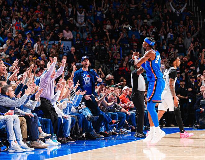 作为全队的助攻王,亚历山大率队实现5人得分上双,这是雷霆一度领先24分的关键。并且,亚历山大在防守端侵略性十足。作为此战的盖帽王,亚历山大在篮板球保护方面也有着稳定的输出。亚历山大实现了全方位爆发,展现了顶级的即战力。 亚历山大在场上庆祝