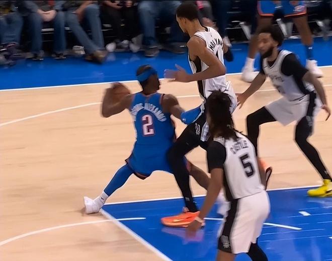 本来这球文班这个位置抢下前场板,可以直接发动进攻了,可是没想到亚历山大又来了一个新动作,叫夹腿动作,这个动作非常凶狠,夹着你的腿,那你能动吗?这种夹腿直接把人放倒,我们在之前的比赛里基本上都是看不见的,更不要说当家核心球员亲自去这么干,结果没有想到亚历山大,竟然真的亲自去这么干了。对对手超巨用剪刀腿,放在哪个联赛里都是不能被允许的。 而且最离谱的是当时这个回合,裁判吹的竟然是没有犯规,本来亚历山大双腿是打开的,看到文班亚马抢到篮板了,故意把他小腿夹住,回过头来没吹雷霆犯规,接下来的回合竟然吹了马刺犯规?这才是真的奇葩。