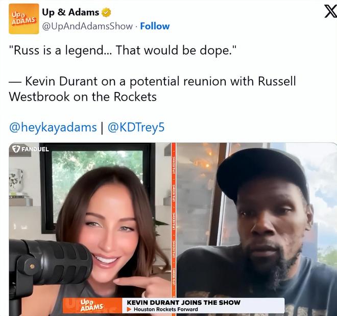 杜兰特:威少是传奇理应留在NBA如果能和他在火箭重聚会很棒