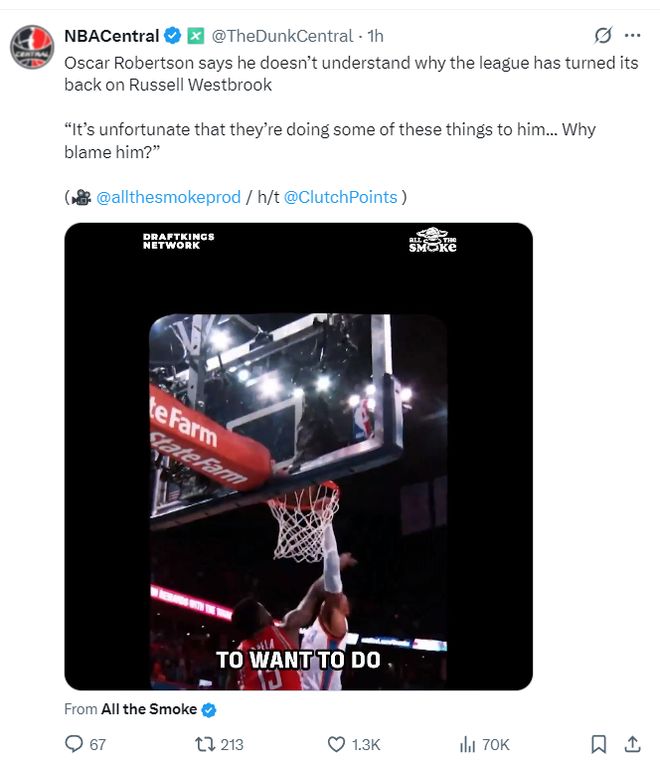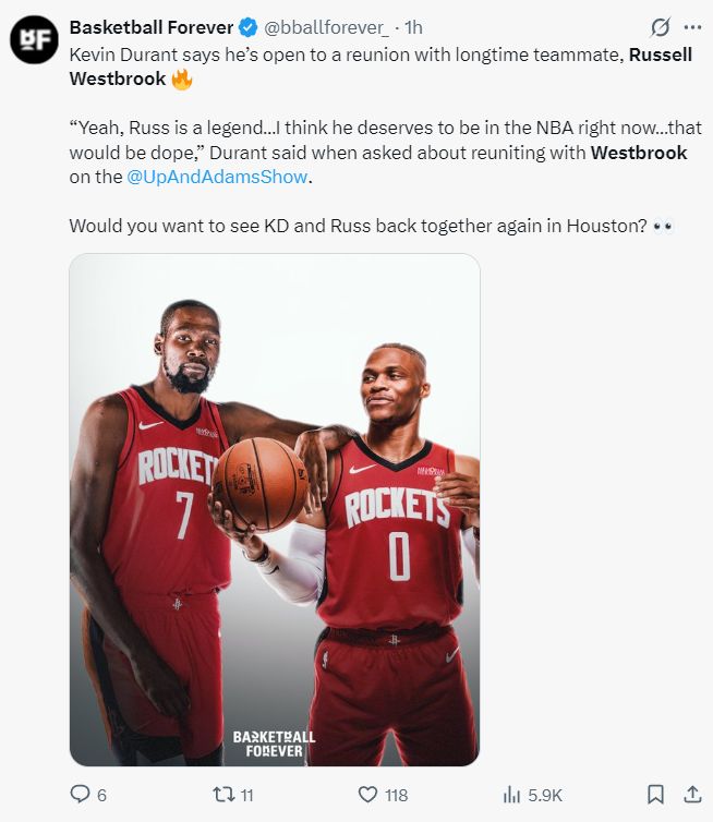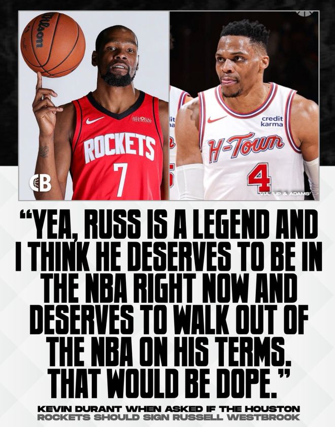北京时间10月9日,火箭球星凯文-杜兰特在接受UpAndAdamsShow访问时谈到了关于拉塞尔-威斯布鲁克与火箭的流言情况,KD表态愿意跟威少重聚。 主持人询问:我从网上听到一些声音,告诉我拉塞尔-威斯布鲁克可能加盟火箭,对吗? 杜兰特说道:我不清楚,我也是听说的。通常当这种事情发生时,会声势浩大,但我在互联网之外并没有听到。威少是传奇人物,我认为他现在理应留在NBA,也应该按照自己的意愿离开联盟。所以没错,那会非常酷。但是这件事我做不了主。 KD的言论至少能证明,他在互联网上听到一些消息说威少可能加盟火箭,他自己也愿意再度跟威少联手,而且杜兰特认为威少应该由自己来决定是否留在NBA打球或离开NBA,不该是这个联盟主动抛弃威少。 37岁的威少难道连一份底薪都不配吗?火箭队要签下威少的难点在于火箭只剩下125万的空间,而要签下威少至少需要239万的老将底薪空间,火箭队虽然是14+3名单可由于空间不足没办法直接签下威少,必须通过交易清理空间才可以签下威少,这是难点。 前NBA球星阿伦-艾弗森在一档节目中力挺威少:看到威少在场上就像看到自己,每一场比赛都拼尽全力,他的竞技状态始终如一,全力以赴贯彻到底 ,我并没有感觉他影响到了其他人。 NBA名宿奥斯卡-罗伯特森在参与一档节目时也力挺威少应该继续留在NBA打球,大O表示:不明白为什么NBA没有球队想要签下威少,很遗憾联盟对他做出这样的事,如此出色的他为何被冷遇,为何要用一些莫须有的问题来责怪他呢? |