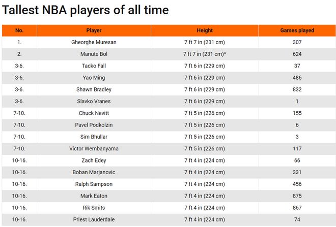 雷速体育10月9日讯 NBA官方将马刺球星文班亚马的身高更新为了7英尺5英寸(2米26),文班亚马超越2米24的扎克·埃迪,成为现役NBA最高的球员。 至此,文班亚马成为NBA历史上第10位身高达到2米26及以上的球员(并列历史第7)。NBA历史上最高的球员是乔治·穆雷桑和曼努特·波尔,两人的身高都是2米31。法尔、姚明、布拉德利和弗拉内斯都是2米29,紧随其后。内维特、波德科尔金、布拉和文班亚马同为2米26,并列排名历史第7高。 值得一提的是,在此前2米26及以上球员中,只有中国球员姚明的场均得分超过10分,他生涯场均可以得到19分9.2篮板1.6助攻和1.9次盖帽。其余球员中,布拉德利生涯场均81.分6.3篮板,穆雷桑场均9.8分6.4篮板,其余无人超过3分。 目前文班亚马的生涯场均得分为22.5分10.8篮板3.8助攻和3.7盖帽,文班亚马极有可能成为史上最强的2米26以上巨人。 |