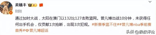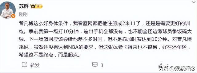 北京时间10月10日,NBA季前赛中国赛,篮网127-132不敌太阳。中国球员曾凡博上演篮网首秀,出场10分06秒,有1次抢断3次犯规。 曾凡博登场10分钟没有任何一次出手引发外界的热议,特别是残酷的第四节和加时赛,篮网队几乎没有任何球员在进攻端把球权给到曾凡博。 媒体人苏群发文点评:曾凡博这么好身体条件,我看篮网都把他注册成2米11了,还是需要更好的训练。季前赛第一场打10分钟,连出手机会都没有,也不能全怪边缘球员争饭碗太独。下一场篮网应该会给他差不多时间,但不是靠加时赛达到10分钟。对曾凡博来说,虽然还没有达到NBA的要求,但这张体验卡得来也不容易,好在还年轻,希望这不是终点,而是起点。 篮球记者贾磊发文点评:我说实话,这球看的真是有点生气,就给二四节最后3分钟,而且队友完全不传球,看都不看,大部分时间小曾都在底角抽烟,一点战术机会都不给。如果不是打了个加时赛,估计还没出汗比赛就结束了。 防守端看上去好像小曾一直在被对手针对,但我不明白为什么让小曾一个大锋线去防对方的后卫,这本身就是把他的弱点暴露了,教练是不懂球还是怎么着?如果是这个情况,还不如让小曾早点回首钢,也别在这气人了 媒体人“海jun的蓝”发文点评:上半场小曾一上来积极性没得说,只不过那种兴奋劲没有太好地去控制身体动作,被连续吹了两次犯规。 第四节虽然比分咬的很紧,但教练还是给了小曾时间,这应该也是为了履行赛前的承诺,只不过实力差距在这摆着,再加上其他球员也想尽可能多的表现,小曾没有出手机会也在意料之中,唯一一次持球进攻差点脱手,最终以传球告终。 在防守端小曾上半场眼疾手快的抢断是一大亮点,另外有几次直接对位持球人,前两次脚步移动上还是有差距被一步过了,第三个球犯规给了巴特勒罚球的机会,篮网被扳平比分;第四次前面防的都很好,但最终还是被对方打进。 这些都是小曾需要总结的,虽然上场时间少,但依然需要回去好好看看录像,找到自己需要改进的地方。 北京记者勇方方发文点评:如果你是一个没看过CBA的篮网球迷,看完这场比赛,你根本没法判断ZENG到底水平如何。 |