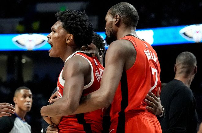 北京时间10月15日,NBA季前赛火箭险胜鹈鹕,第二节场上阿门和老六发生冲突,赛后两人拥抱和好,前NBA榜眼劝阿门冷静小心禁赛,杜兰特与特纳在线上聊了一番。 打到5分38秒场上爆发冲突,阿门-汤普森和抱摔,双方扭打导致现场乱作一团,申京第一时间劝架抱住老六,杜兰特等人则是拉住阿门,裁判多角度回放,最终吹罚阿尔瓦拉多抢篮板犯规在先,追加技术犯规,阿门因打到对手的头部吃到一级恶意犯规。 阿尔瓦拉多卡位时突然 赛后阿门和阿尔瓦拉多握手和好并且拥抱致意;本场比赛,阿门-汤普森出战24分钟,8投5中拿到21分5篮板3助攻,阿尔瓦拉多替补登场15分钟,7投2中拿到8分3篮板2助攻。 |
