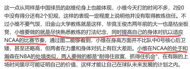 对于赵维伦被冷藏,媒体人海Jun的蓝也发文谈到,他表示旧金山大学的教练就是这样,毕竟王俊杰在大一赛季基本上也是枯坐板凳,对于赵维伦而言,要做的就是尽快熟悉教练的打法理念,同时提高自己的身体对抗,以适应NCAA的比赛节奏,他现在的处境和杨瀚森在NBA有些类似,都要“耐得住寂寞,抓得住机会”,需要在有限的上场时间里,去尽可能证明自己的价值。