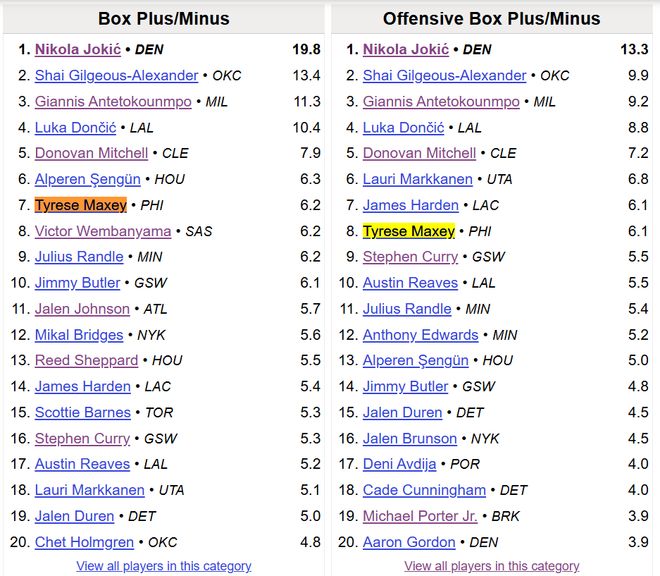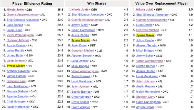 看高阶数据的话,马克西的惊喜可能更多。 on/off值,马克西在场时,76人百回合能拿到118.4分、净胜对手3.7分,反之马克西不在场,76人百回合只能得到104.7分、净负对手8.6分,绝对的巨星级影响力; BBR的高阶数据,马克西的PER值、WinShare、VORP(不可替代值)、BPM分别排在联盟第12、第7、第6、第7,多项数据后面跟的还是库里、文班这样的大佬。