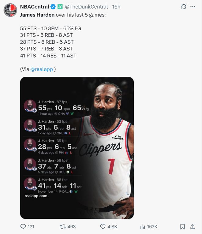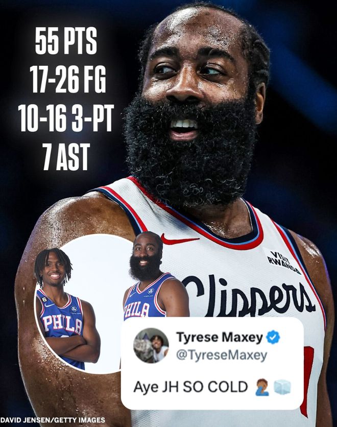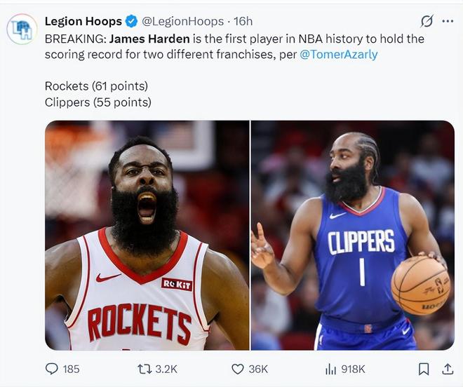 这一场比赛哈登创造了超多的纪录: 1.首节27分快船生涯单节新高; 2.半场35分是赛季联盟所有人最高; 3.55分是哈登赛季新高得分; 4.55分也是快船队史单场新高; 5.哈登是快船队史第二位拿到50+的球员; 6.哈登单场命中10个三分追平快船队史最多; 7.35岁以上球员半场35分历史4人; 8.生涯第25次50+追平科比排在历史第三多; 9.历史唯一,哈登拥有快船(55)、火箭(61)两支球队的单场最高; 10.哈登是历史年龄第四大拿到55分的球员; 11.哈登10个三分球也是生涯单场最高,追平19年自己的纪录; 12.哈登过去五场比赛拿到192分,此前从未有36岁+的球员做到过; 13.55分+2失误,是哈登生涯单场50+失误最少得一次; 14.生涯第12次拿到55+,历史上仅次于张伯伦;
