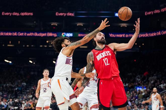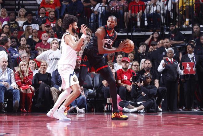 杜兰特。 得篮板者得天下 对于如今的火箭队而言,一口气将球放进篮筐并不轻松,但只要能把球送到篮筐附近,就已经成功了一半。 根据“Cleaning the Glass”给出的数据,火箭队的半场进攻效率只排在第13位,但由于他们在进攻篮板上的出色表现,他们获得了更多的进攻机会。 比如此前对阵丹佛掘金队的比赛,火箭队的真实投篮命中率比对手低了10个百分点(53.5%对63.7%),通常情况下,这样的数据意味着一场惨败,但火箭队仅以3分惜败。原因在于,那场比赛火箭队多抢了7个进攻篮板,以及多次通过争抢球权获得的额外进攻机会。 篮板,成为了火箭队的生命线,即便他们并不擅长补篮得分,二次进攻的效率仅排在联盟第20位。但量变产生质变,本赛季火箭队每次投篮不中后,球队依然能收获0.328分——这一比例是联盟其他球队的两倍。 太阳队主帅乔丹·奥特就曾这样形容火箭队:“他们的身高优势对我们来说是一个全新的挑战,火箭队外线球员的运动能力很强,以及他们首发的两名传统中锋身材高大,双方对于球权的争夺会非常激烈。”