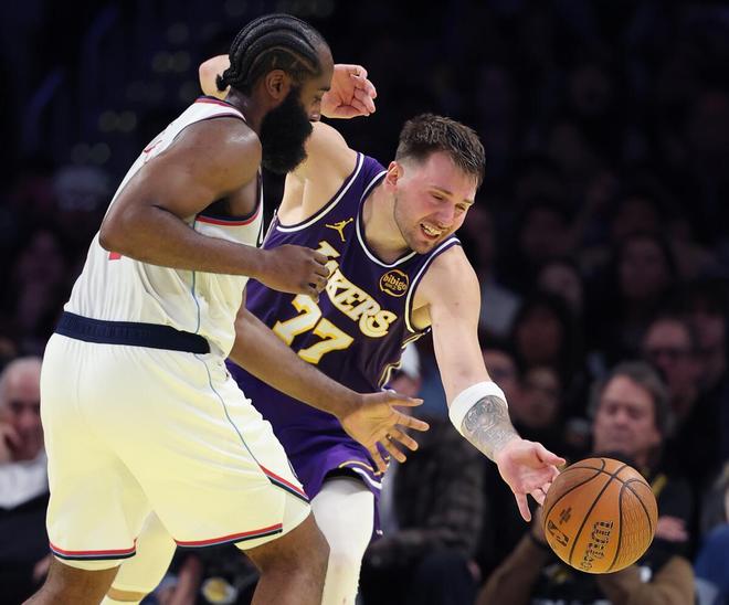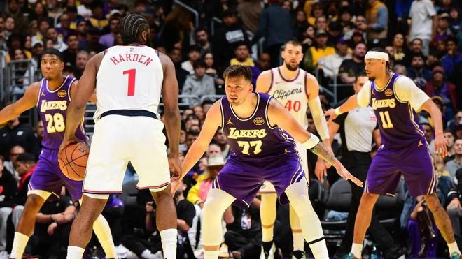 北京时间11月26日,湖人与快船展开了NBA杯小组赛西部B组的对决。主场作战的湖人,志在延续强势表现。洛城德比的巅峰对决,是当天的焦点大战。该场比赛,还是小卡伤愈复出的第二场比赛。两队在场上反复缠斗,比赛进行至末节最后时刻,才得以分出胜负。 詹姆斯创NBA历史第1神迹,湖人5连胜升至西部第2!东契奇准3双,里夫斯末节18分暴走! 全场比赛回顾 东契奇开场后火力全开,帮助紫金军团抢占先机。哈登携手科林斯砍分,快船多点开花得以紧咬比分。首节打完,湖人落后1分,东契奇单节轰下24分。 哈登防守东契奇