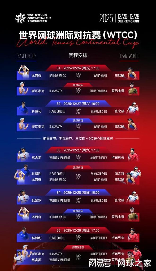 我们再来关注一项表演赛。北京时间今天下午5点,世界网球洲际对抗赛(WTCC)将在深圳大运中心体育馆开打。波兰名将斯瓦泰克、哈萨克斯坦名将莱巴金娜、瑞士名将本西奇、俄罗斯名将卢布列夫、意大利新星科博利、摩纳哥人瓦舍罗等一众球星将和中国球员张之臻、王欣瑜一道,为球迷奉献一场精彩的年终网球盛宴。