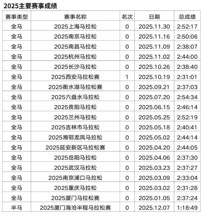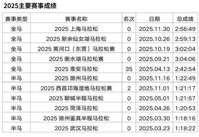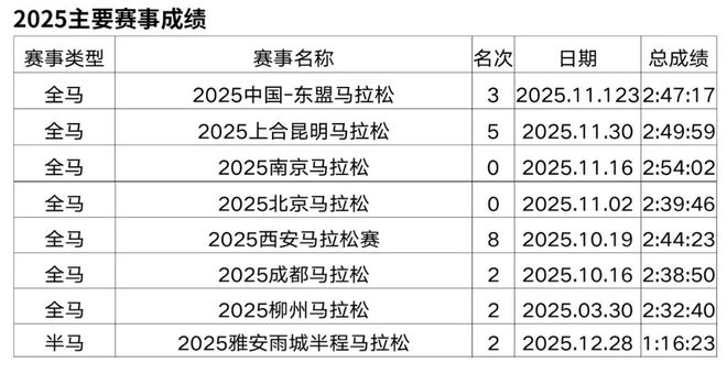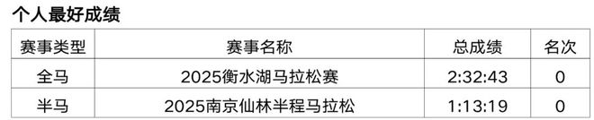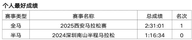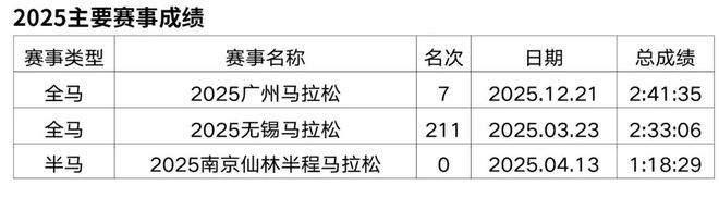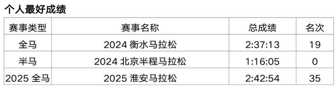 原从事办公室文员工作,2018年开始接触马拉松和越野赛,在此之前无专业队服役经历,高中时期在校练过一年400米专项。2019年首半马143,首全马316,2021年半马117,全马238,全程马拉松达标国家健将等级。