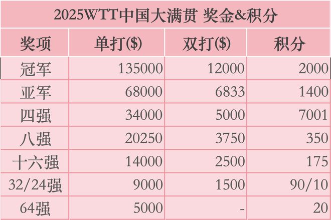 从奖金结构来看,单打与双打项目之间存在显著差异,这是WTT赛事一直以来的惯例,也是球迷们讨论的热点之一:单打冠军不仅可以获得2000WTT世界积分的加成,更有13.5万美元的奖金;相比之下,双打项目虽也能获得2000积分的加成,可奖金仅有1.2万美元。