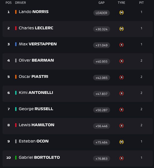 第48圈,安东内利、皮亚斯特里和汉密尔顿同圈进站,在维修区中,皮亚斯特里完成了对安东内利的超越升至第7。随后一圈,拉塞尔和比尔曼也选择进站!一停的比赛竟然变成了两停?!
