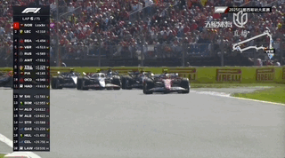 第6圈,维斯塔潘和汉密尔顿在一号弯发生碰撞,随后两人在四号弯依旧互不相让!汉密尔顿冲出赛道驶上草坪后没有通过赛事规定的线路返回赛道,依旧处于领先位置。乱战之下,维斯塔潘的比赛节奏受到影响,被身后的比尔曼超越跌至第5。而在他身后是安东内利和拉塞尔两辆梅奔。