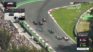 随着五盏红灯熄灭,墨西哥站正赛正式开始!诺里斯、勒克莱尔、汉密尔顿和起步出色的维斯塔潘几乎并排进入一号弯!但激进的维斯塔潘在外线制动出现问题,直接冲出了赛道驶上草坪。而勒克莱尔则在乱战中,同样因为切弯升至头名。