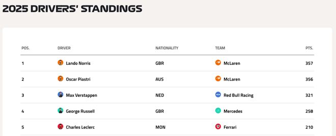 北京时间10月27日凌晨,2025赛季F1墨西哥站结束了正赛争夺!最终,诺里斯强势实现Pole to Win,由于他的队友皮亚斯特里最终以第五完赛,诺里斯拿到25分的同时超越队友1分暂时升至车手积分榜第一!