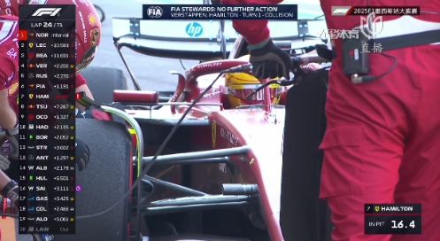 第23圈,安东内利进站换上黄胎。第24圈,汉密尔顿进站完成换胎的同时执行10秒罚时。