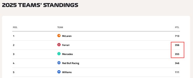 第六至第十名分别是:安东内利、拉塞尔、汉密尔顿、奥康以及博托莱托。哈斯车队在墨西哥站双车拿分!而同样双车拿分的法拉利,因勒克莱尔(P2)和汉密尔顿(P8)的出色发挥,在年度车队积分榜上反超梅奔1分来到第二!