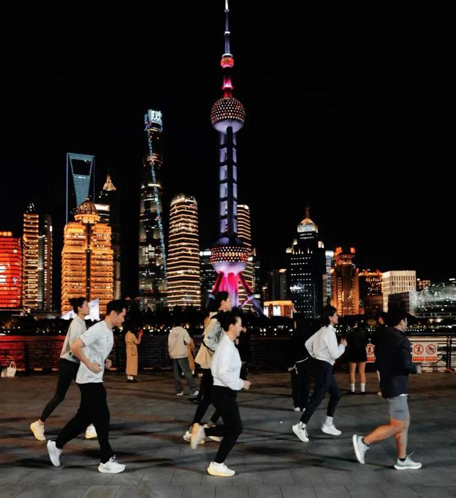 五星炫跑吧成员和北外滩高颜值夜跑团,从中国邮政储蓄银行上海分行营业部出发进行一段五公里左右的夜跑训练。他们中的大部分人都将参加11月23日举行的2025虹口10公里精英赛,大家借着此次机会提前踩点、热身备战。
