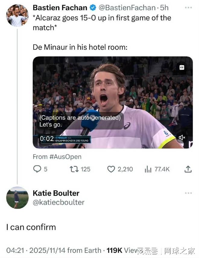 更令人惊喜的是,德米纳尔的女友博尔特随后亲自回复证实:“我可以确认是这样。”这段互动瞬间在社交媒体上引发热议。