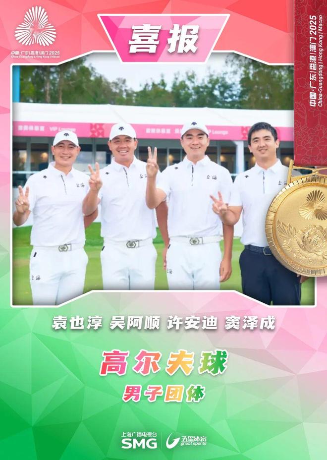 第十五届全国运动会高尔夫球男子团体赛中,由窦泽成、吴阿顺、袁也淳、许安迪组成的上海队,最终以四轮总成绩802杆(-38)摘得金牌!